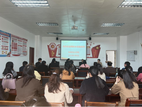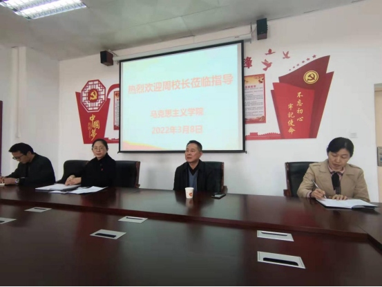 周校长指出,思政课在落实立德树人根本任务中发挥着重要作用,马院领导班子和全体教师要充分认识到上好这门课程的重要性,认识到加强思政课建设的紧迫性,以高质量的教学科研和高水平的教师队伍,发挥好马院在意识形态工作、思想政治工作、社会主义核心价值观教育等方面的主阵地、主渠道作用。