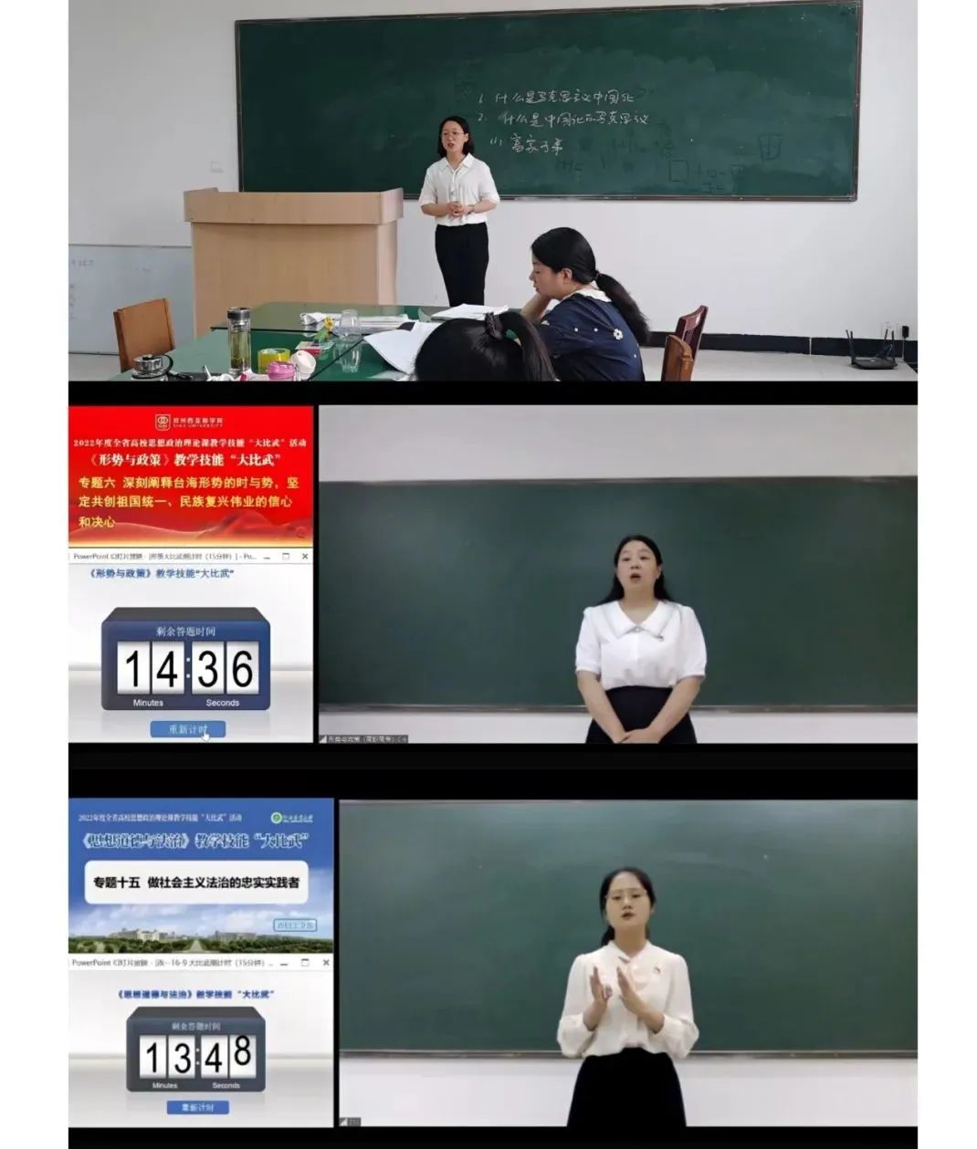 本次“大比武”活动于6月11日至20日举行。在学校思政课教学技能“大练兵”活动的基础上,马院选派了肖园丽、张艳、张海玉三位教师参加此次比赛。“大比武”活动采取选手线上、评委集中线下方式举行。来自全省150多所本专科学校的519名参赛教师齐聚“云端”,线上随机抽取讲授专题名称,并以“讲授+板书”的形式完成教学展示。