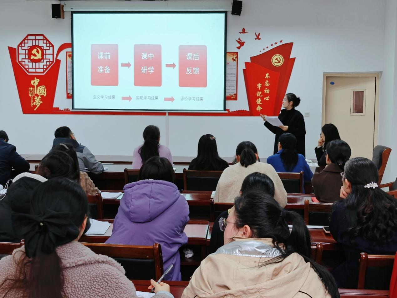 接着,是德法教研室集体备课展示环节,陈金凤老师以“OBE理念如何融入《思想道德与法治》课”为主题进行教学展示,陈金凤老师从OBE教育理念概念入题,从课前准备、课中研学、课后反馈三方面介绍了OBE理念融入《思想道德与法治》课程的实施路径,并结合案例实施探讨了OBE理念如何真正融入德法课教学过程中。