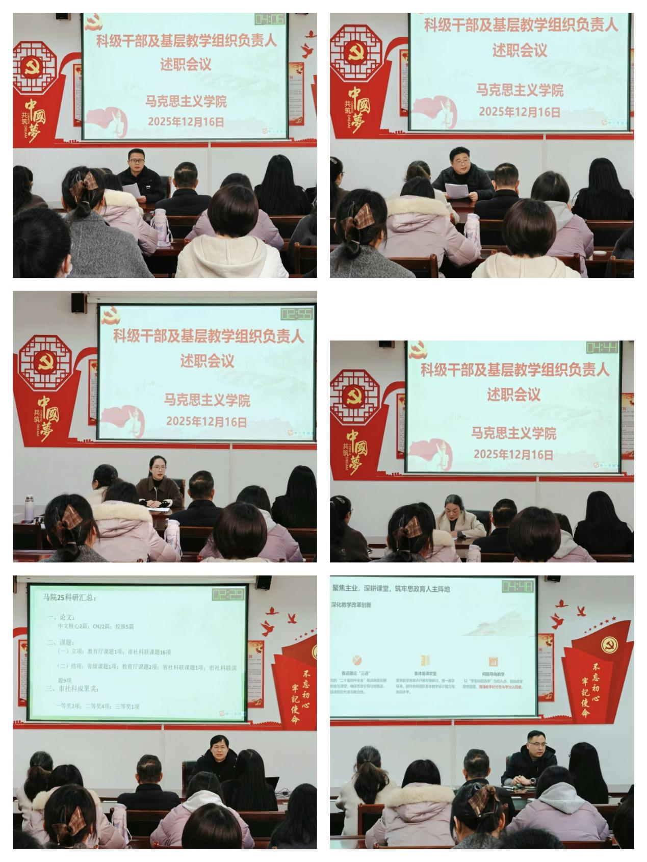 会上,2名科级干部及5名基层教学组织负责人结合工作实际,围绕课程建设、教学改革、科研创新、实践育人、管理服务等方面逐一进行详细汇报,既分享了工作中的亮点和经验,也剖析了存在的问题和不足,同时提出了改进措施和新一年工作谋划。