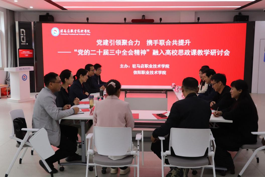 11月13日,正规滚球app平台官网正规滚球app平台官网与驻马店职业技术学院正规滚球app平台官网在驻马店职业技术学院大学生思想政治教育基地联合举行党建引领聚合力,携手联学共提升——党的二十届三中全会精神融入高校思政课教学研讨会。驻马店职业技术学院党委书记苏新留出席研讨会并讲话。驻马店职业技术学院马院院长李菊蕾、党总支副书记张钊,正规滚球app平台官网马院党支部书记郑玉秀、副院长柯涛,及两校的部分教师代表参加研讨会。